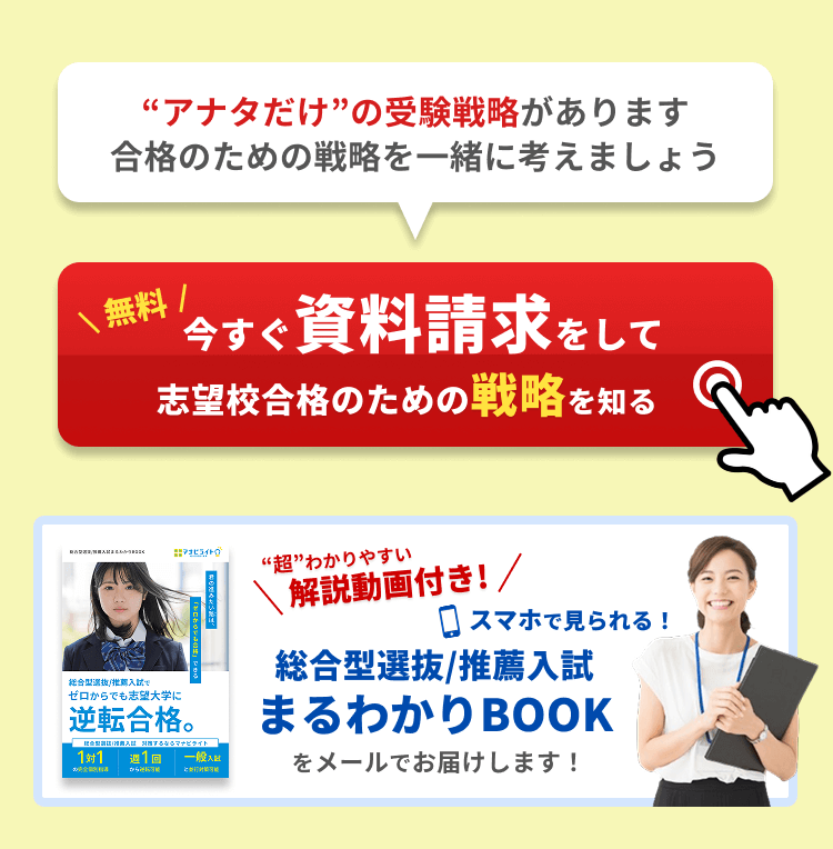 という方は、完全無料の「総合型選抜/推薦入試まるわかりBOOK」をぜひお受け取りください。